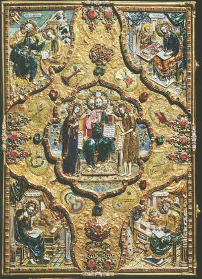 ![]() | Илл.10 Оклад Евангелия Тереньтьев Дмитрий, Фробос Юрий, Васильев Михаил, Нырин Юрий, Нырин Степан, Голиаш, Креймер Христиан, Семидел Иона Школа или худ. центр: Москва (Мастерские Московского Кремля). 1678 г. Золото, драгоценные камни; чеканка, эмаль 49 × 29.6 см Оружейная палата Московского Кремля, Москва, Россия. Инв. КН-26, оп. 10185 Изображение воспроизводится по изданию: Журавлева В. Л., Костина И. Д., Мунтян Т. Н. Искусство русских ювелиров. Девять веков истории. М., ИПЦ «Художник и книга», 2004. |