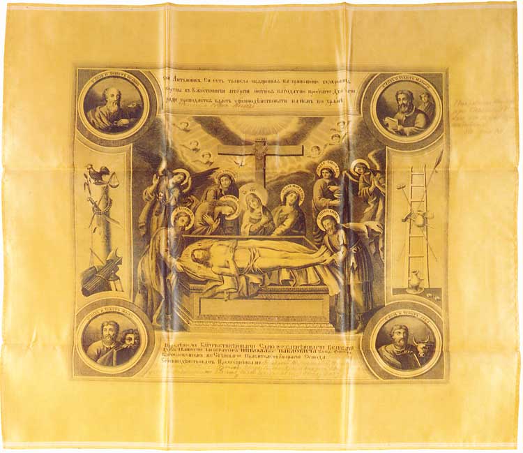![]() Илл. 13. Положение во гроб. Антиминс. 1839 г. Желтый шелк, гравюра на меди (офорт). 59.3 × 52 см Центральный музей древнерусского искусства им. Андрея Рублева, Москва, Россия. Инв. КП 5054 Изображение воспроизводится по изданию: Духовные светочи России / Портреты, иконы, автографы выдающихся деятелей Русской Церкви конца XVII — начала XX веков. М., МСД, 1999. |