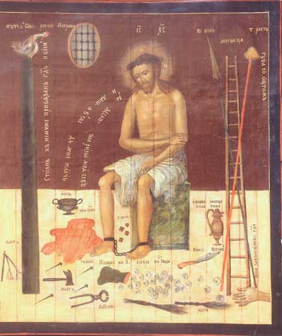 Воини же жидовствии, вземши у Пилата Господа нашего Исуса Христа, и снемше с него одеяние его, и одеяша его хламидою червленою, и сплетше терновен венец, тесен велми. И едва возложиша на святую главу его и згнетше. И биша по тесному венцу, и от острия терновнаго святую главу его пронзиша даже до мозгу. И тогда истече пречистыя крове его многое множество, якоже от крове его и земли обагритися. И даша ему в десную руку трость, и поклоньшеся на колену пред ним ругахуся ему, глаголюще: радуйся, царю иудейский, и плюнувше нань прияша трость, и бияху по главе его. Потом же воини беззаконнии нападоша на Господа нашего Исуса Христа, с яростию, и биша его немилостивно, ибысть ему мука горши первых мук, и вся первыя раны его повредиша. И егда поругашася ему, совликоша с него багряницу и облекоша его в ризы его, и всадиша его в темницу дондеже уготовят крест ему»[31].