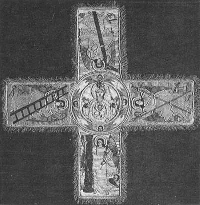 ![]() | Илл.2. Богоматерь Знамение. Крещатый покровец. Опис. в прим. [6] Школа или худ. центр: Москва (Мастерская царевны Софьи Алексеевны). Конец XVII в. Шелковая ткань, парча, золотные, серебряные и шелковые нити, жемчуг, алмазы, рубины, изумруды, золото, серебро, бахрома. 65 × 65 см Государственный Русский музей, Санкт-Петербург, Россия. Инв. ДРТ 323 Изображение воспроизводится по изданию: Древнерусское шитье XV — начала XVIII века в собрании Государственного Русского музея: Каталог выставки / Авт. вступ. ст. и сост. Л. Д. Лихачева. Л., 1980. |