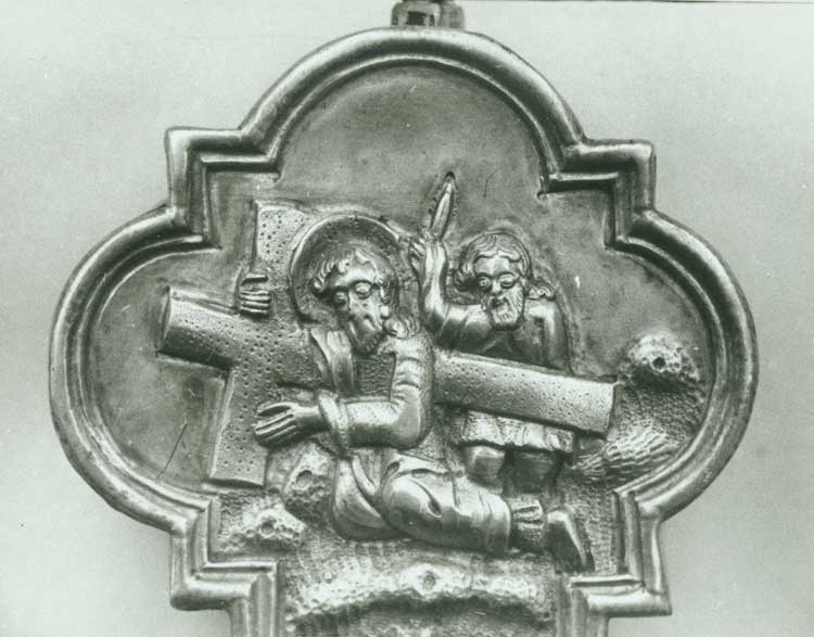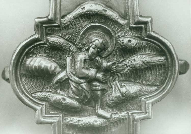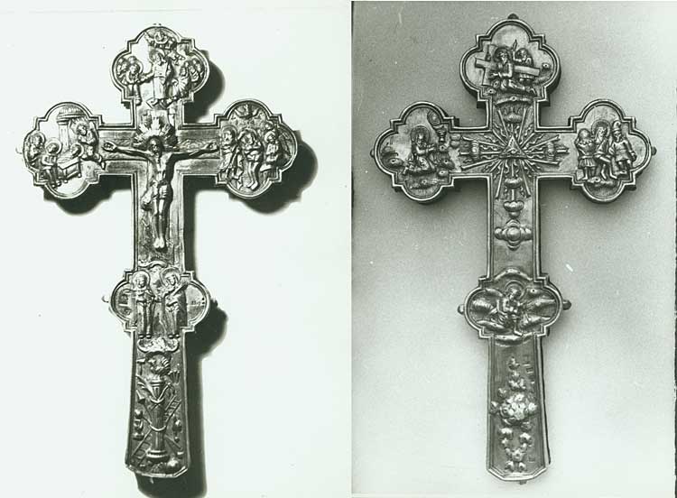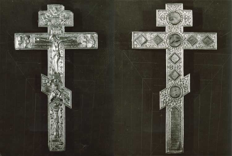 На серебряном напрестольном кресте второй половины XVIII века из собрания Иркутского объединенного музея можно видеть фигуру апостола Петра на лицевой стороне, непосредственно над Орудиями Страстей Господних[9]. Вверху изображен Господь Саваоф в облаках и Дух Святой в виде голубя, в ветвях креста — поясные фигуры Богоматери и Иоанна Богослова на облаках, руки их сложены молитвенно перед грудью. На оборотной стороне креста — барочный орнамент в виде гирлянд и венков. Сам крест имеет пышные барочные формы с трехлопастным завершением концов, он массивен и тяжеловесен. Близок ему по перегруженности орнаментацией серебряный напрестольный крест московской работы 1762 года, исполненный для Ниловой пустыни[10].