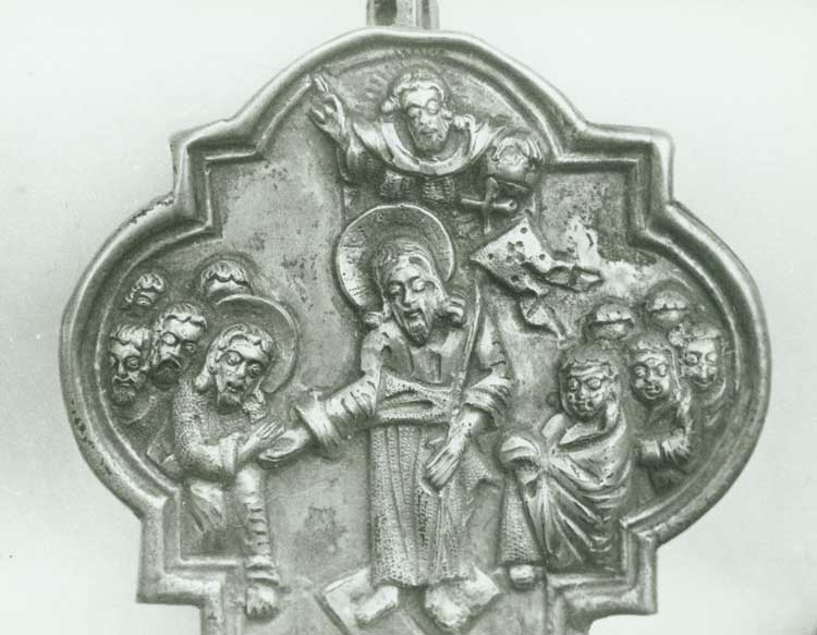 Что же явилось основой, прототипом столь развитой схемы расположения Орудий Страстей Господних на крестах русской работы второй половины XVII–XIX веков? Остановимся вначале на изобразительных источниках данной композиции. Нет сомнений, что в основе ее лежат произведения западного искусства XIV–XVI столетий, в которых усиленно разрабатывались темы, относящиеся к Страстному циклу. Одним из источников иконографии Орудий Страстей на Западе явилась индульгенция, соединенная с 1216 года с молитвой перед образом Спаса Нерукотворного, в которой перечислялись реликвии, связанные с истязаниями Христа[18].