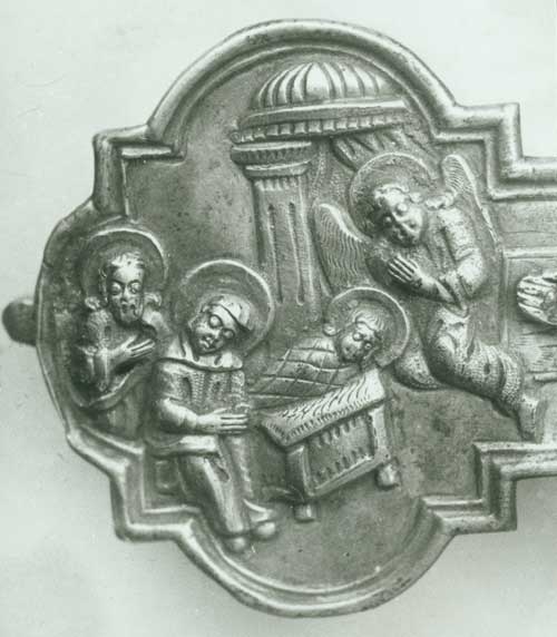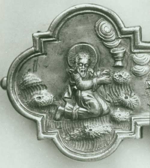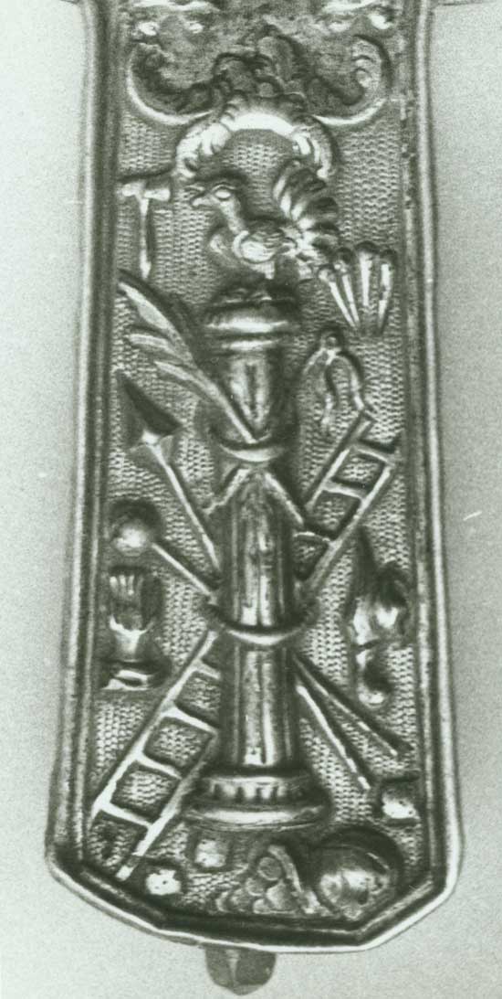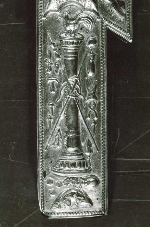 ![]() Илл. 6. Крест напрестольный (мощевик?) Неизвестный мастер с инициалами IПМ. Центр изготовления: Москва. Последняя четверть XVIII в. Серебро, дерево; чеканка, золочение, чернь. 40 × 24 см Псковский гос. историко-архитектурный и художественный музей-заповедник, Псков, Россия. Инв. 337 Изображение воспроизводится по изданию: Родникова И. С. Напрестольные серебряные кресты из собрания Псковского музея // Ставрографический сборник. Книга II: Крест в Православии. Сб. статей / Сост., науч. ред. и вступит. ст. С. В. Гнутовой. М.: Изд-во Московской Патриархии; Изд-во «Древлехранилище», 2003. Литература: Гнутова 1994. Гнутова С. В. Орудия Страстей Христовых на русских крестах XVII–XIX веков // Филевские чтения. Вып. V / Материалы третьей научной конференции по проблемам русской культуры второй половины XVII — начала XVIII веков. — М., 1994. — Стр. 70, 80, прим. 12. Родникова 2003/1. Родникова И. С. Напрестольные серебряные кресты из собрания Псковского музея // Ставрографический сборник. Книга II: Крест в Православии. Сб. статей / Сост., науч. ред. и вступит. ст. С. В. Гнутовой. — М.: Изд-во Московской Патриархии; Изд-во «Древлехранилище», 2003. — Кат. № 24, стр. 252–253. |
