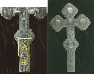 ![]() Илл. 4. Крест напрестольный (мощевик?) Фролов Я., Неизвестный мастер с инициалами ВА. Центр изготовления: Москва. 1768 г. Серебро, дерево; чеканка, золочение, литье. 45 × 29 см Псковский гос. историко-архитектурный и художественный музей-заповедник, Псков, Россия. Инв. 335 Изображение воспроизводится по изданию: Родникова И. С. Напрестольные серебряные кресты из собрания Псковского музея // Ставрографический сборник. Книга II: Крест в Православии. Сб. статей / Сост., науч. ред. и вступит. ст. С. В. Гнутовой. М.: Изд-во Московской Патриархии; Изд-во «Древлехранилище», 2003. Литература: Гнутова 1994. Гнутова С. В. Орудия Страстей Христовых на русских крестах XVII–XIX веков // Филевские чтения. Вып. V / Материалы третьей научной конференции по проблемам русской культуры второй половины XVII — начала XVIII веков. — М., 1994. — Стр. 70, 80, прим. 12. Родникова 2003/1. Родникова И. С. Напрестольные серебряные кресты из собрания Псковского музея // Ставрографический сборник. Книга II: Крест в Православии. Сб. статей / Сост., науч. ред. и вступит. ст. С. В. Гнутовой. — М.: Изд-во Московской Патриархии; Изд-во «Древлехранилище», 2003. — Кат. № 21, стр. 248–250. |