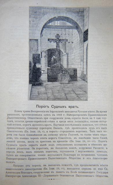 Близ храма Воскресения в Иерусалиме находится Русское место. Во время раскопок, произведенных здесь в 1883 г. Императорским Православным Палестинским Обществом при сооружении дома, отрыты были, на 5 сажень глубин остатки древне-еврейской стены и среди них лосняшиеся, сильно потертый ногами, порог древних врат. Научные исследования показали, что стены принадлежали судилищу (претории) Пилата, где происходил суд его над Спасителем (Ев. Иoaн. 19, 5), а порог — городским воротам. Так как ворота эти были ближайшими к лобному месту Голгофе, то болеe чем вероятно, что именно через этот порог Спаситель, в последние часы Своей, земной жизни, шел с крестом на пропятие (Ев. Иоан. 19, 16-17). Порог Судных врат скрыт ныне под стеклянным колпаком и обнесен железною решеткою. За порогом, на большом камне, водружено Распятие, а перед ним, над самым порогом, спускаются 7 неугасимых лампад. Здесь же совершается чтение неусыпного Псалтыря по почившим членам Императорского Православного Палестинского Общества и его благотворителям.