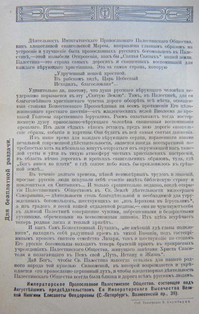 Императорское Православное Палестинское Общество, состоящее под Августейшим председательством Ея Императорского Высочества Великой Княгини Елисаветы Феодоровны (С.-Петербург, Вознесенский пр. 36).