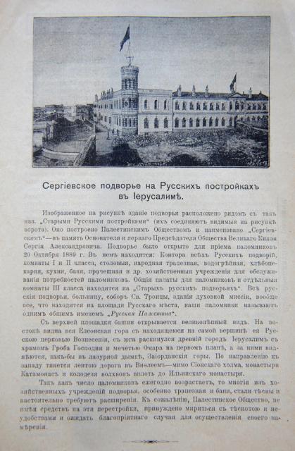 Изображенное на рисунке здание подворья расположено рядом с так называемыми „Старыми Русскими постройками" (их соединяют видимые на рисунке ворота). Оно построено Палестинским Обществом и наименовано „Сергиевским" — в память Основателя и первого Председателя Общества Великого Князя Сергия Александровича. Подворье было открыто для приемa паломников 20 Октября 1889 г. В нем находятся: Контора всёх Русских подворий. комнаты I и II класса, столовые, народная трапезная, водогрейная, хлебопекарня, кухня, баня, прачечная и др. хозяйственные учреждения для обслуживания потребностей паломников. Общие палаты для паломников и отдельным комнаты III класса находятся на „Старых русских подворьях". Все русские подворья, больницу, собор Св. Троицы, здания духовной миссии, вообще все, что находится на площади Русского места, наши паломники называют одним общим именем „Русская Палестина".
