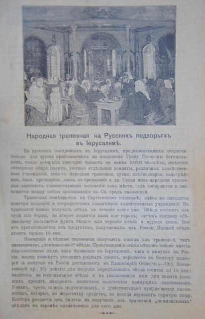 На русских постройках в Иерусалиме, предназначенных исключительно для пpиемa прибывающих на поклонение Гробу Господню богомольцев, которых ежегодно бывает не менее 10.000 человек, имеются обширные общие палаты, уютные отдельный комнаты, различный хозяйственные учреждения как-то: народная трапезная, кухня, хлебопекарня, водогрейная, баня, прачечная, лавка с припасами и др. Среди них народная трапезная занимает главенствующее положение как место, где собираются и знакомятся между собой прибывающие в Св. град паломники.