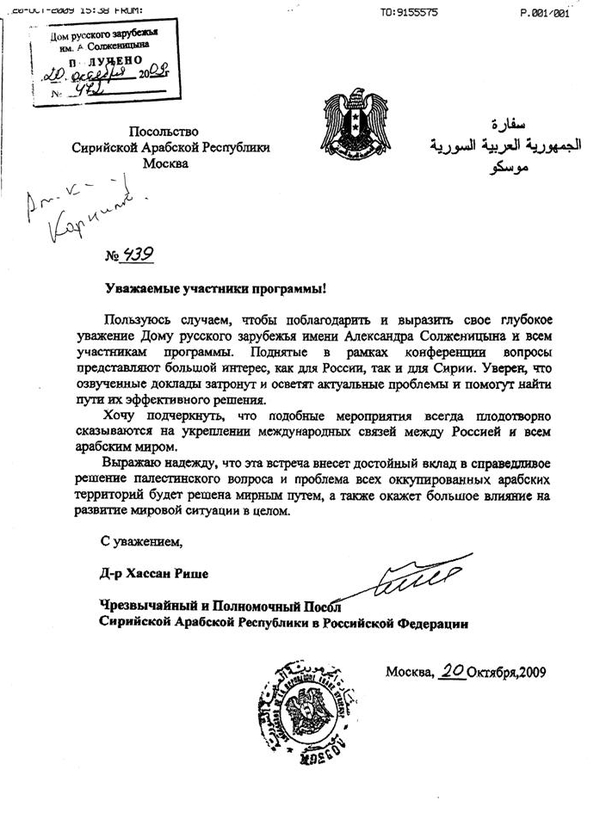 Приветствие Посла Сирийской Арабской Республики в Российской Федерации д-ра Хассана Рише
