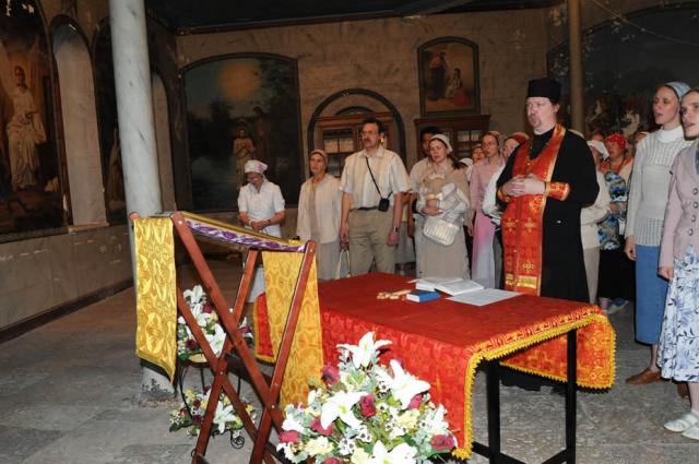 После молитвы иерей Григорий Антипенко произнес проникновенную проповедь: «Я рад совершить молитву в стенах подворья Императорского Православного Палестинского Общества, которое не так давно было возвращено России для того, чтобы русские паломники могли всегда ощущать себя вместе и в заботе со стороны тех, кому благословляется в этом месте трудится, для того, чтобы наша Русская Держава и здесь обретала для себя молитву, чтобы здесь люди объединялись, чтобы они здесь молились.