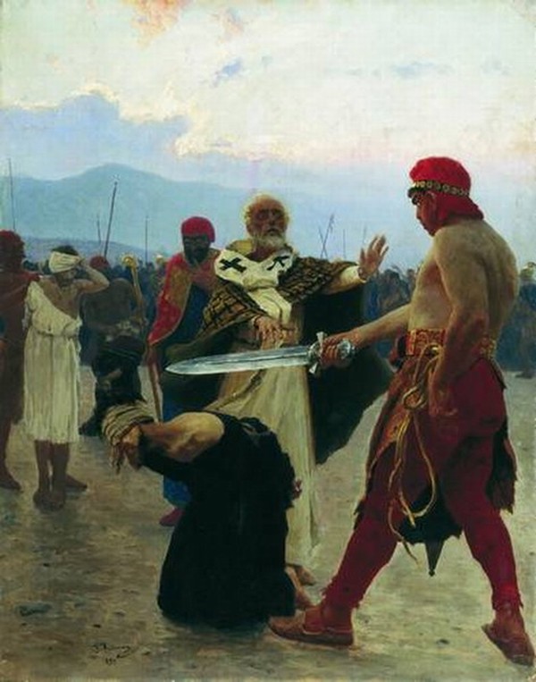 ![]() Николай Мирликийский избавляет от смертной казни трех невинно осужденных. И. Е. Репин. 1890 г. Бумага на холсте, масло. 126,5x98,5 см Киевский музей русского искусства