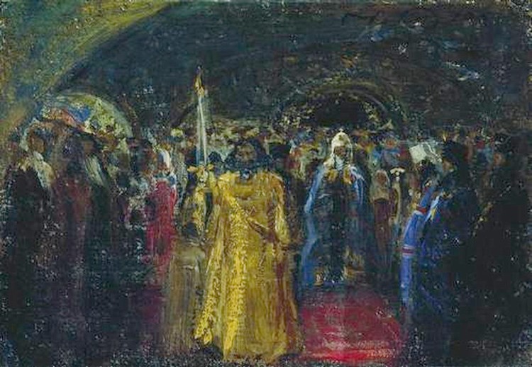 ![]() Выход патриарха Гермогена. И. Е. Репин. 1881 г. Картон, масло. 12,3х18,4 см Эскиз неосуществленной картины Государственная Третьяковская галерея, Москва |