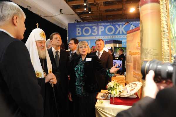 Святейший Патриарх Кирилл и Председатель ИППО С.В.Степашин у стенда ИППО на Х выставке-форуме «Православная Русь»