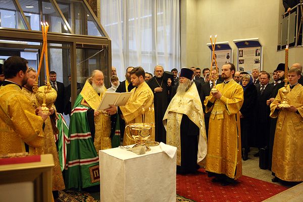 Предстоятель Русской Православной Церкви совершил малое освящение домового храма в честь преподобного Сергия Радонежского в здании Счетной палаты. Святейшему Патриарху Кириллу сослужили протоиерей Владимир Диваков, секретарь Патриарха Московского и всея Руси по городу Москве, благочинный Центрального округа, и протоиерей Владимир Волгин, настоятель храма Софии Премудрости Божией в Средних Садовниках.