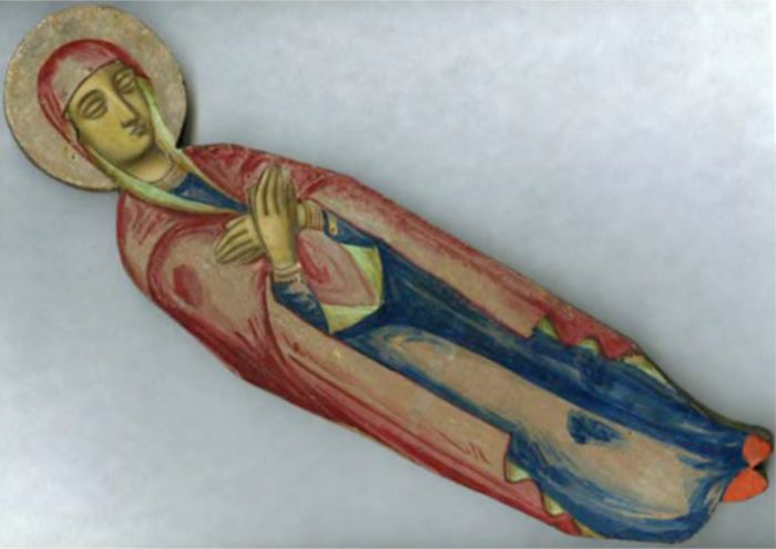 [11]. Оборотная сторона фигуры Богоматери с плащаницы «Успение» Инв. № ВОКМ 5308 также расписана, но не имеет золотого декора. Особенности моделировки одежд (расположение складок соответствует склоненной голове со стороны лика и положению рук, сложенных перед грудью) позволяют предположить, что именно оборотная сторона изначально планировалась в качестве лицевой, что подтверждается и зеркальным разворотом фигуры. Возможно имеющиеся дефекты деревянной основы (две вмятины) заставили иконописца перевернуть вырезанную по контуру фигуру, и роспись оборотной стороны является вынужденной мерой.