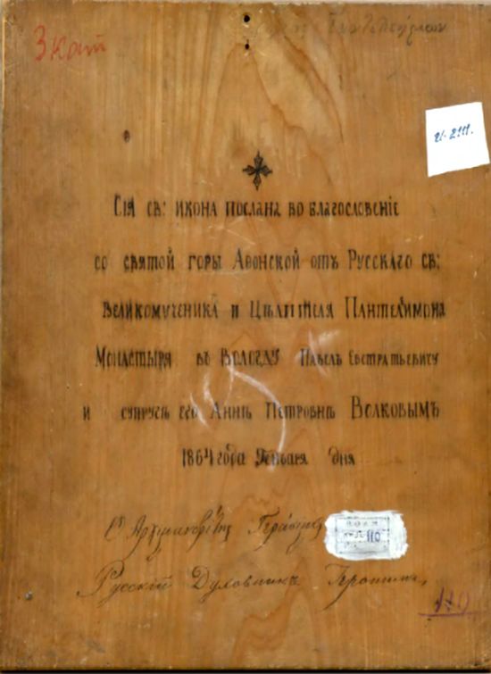 Илл. 12. Надпись на оборотной стороне иконы "Святой Пантелеймон". 1864 г. Афон