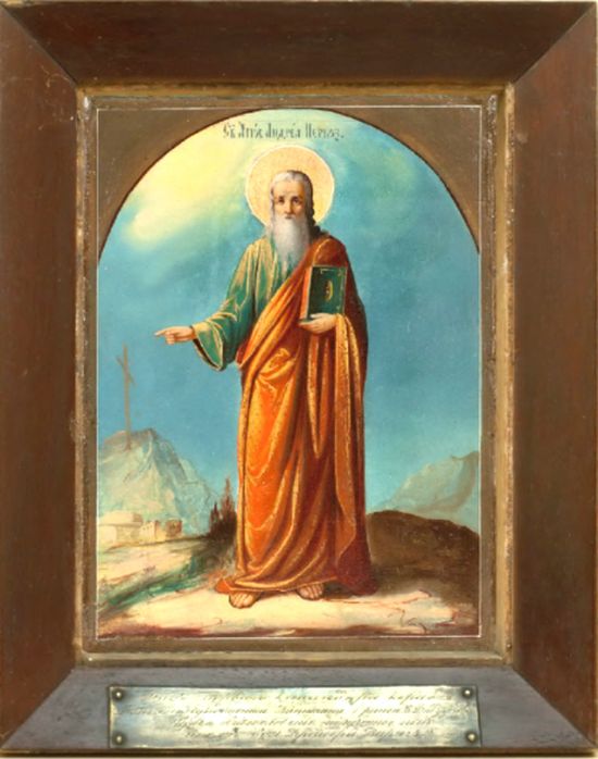 Ростовое изображение св. апостола Андрея Первозванного соответствует иконографии главного храмового образа Андреевского скита на Афоне, основанного в 1841 г. двумя русскими монахами старцами Виссарионом и Варсонофием, приобретшими у монастыря Ватопед келью с церковью во имя прп. Антония Великого. В 1860-1880-х гг. скит переживает время своего расцвета: укрепляется его административный статус и возрастает число насельников, строятся новые храмы, ведется активная издательская деятельность, работают многочисленные мастерские, в том числе иконописная[32].