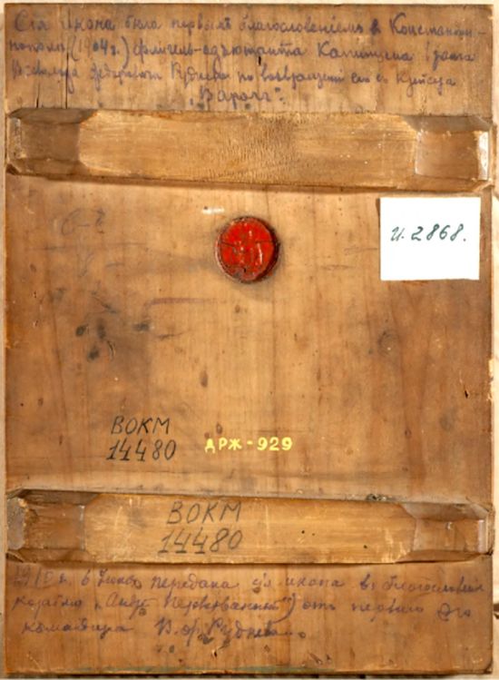 Большую историческую ценность представляет еще одна хранящаяся в вологодском музее икона с изображением св. апостола Андрея Первозванного, написанная в одноименном ските на Афоне[31]. Она связана с именем героя Русско-японской войны, командира легендарного крейсера «Варяг» Всеволода Федоровича Руднева (1855-1913) (Илл. 13). Икона условно включена нами в рассматриваемую группу памятников, т. к. история ее приобретения не связана с сознательным хождением по святым местам. На тыльной стороне иконы имеются две надписи, выполненные фиолетовыми чернилами (Илл. 14). Над верхней шпонкой надпись в четыре строки: Сiя икона была первымъ благословенiем в Константи-//нополе (1904 г.) флигель-адъютанта Капитана 1 ранга // Всеволода Федоровича Руднева по возвращении его с крейсера «Варягъ». Под нижней шпонкой надпись в три строки: 1910 г. 6 Iюня передана сiя икона в благословенiе // корабля «Андрей Первозванный» от перваго его // командира В. Ф. Руднева. (313)