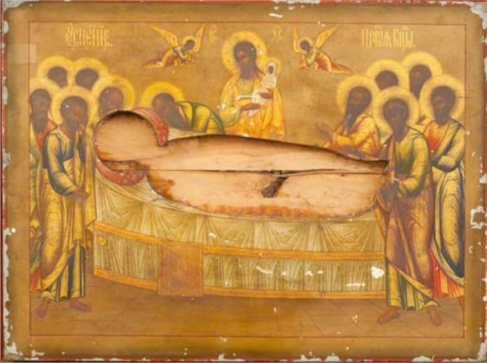 [6]. Икона Успение Богоматери. 1870-е гг. Россия (икона-ковчег). Инв. № ВОКМ 8549. 39,8х52,9х3,8 см. Основа из трех частей, с ковчегом под вкладную фигуру Богоматери, две врезные торцовые шпонки. Дерево хвойной породы (кипарис), паволока, левкас, темпера, золото твореное. Вкладной образ Богоматери (врезок). Вторая половина Х1Х в. Иерусалим. 8,6х32,5х1,5. Кипарис, темпера (?), Цветные лаки. Время поступления в музей неизвестно.
