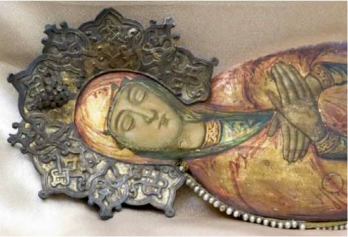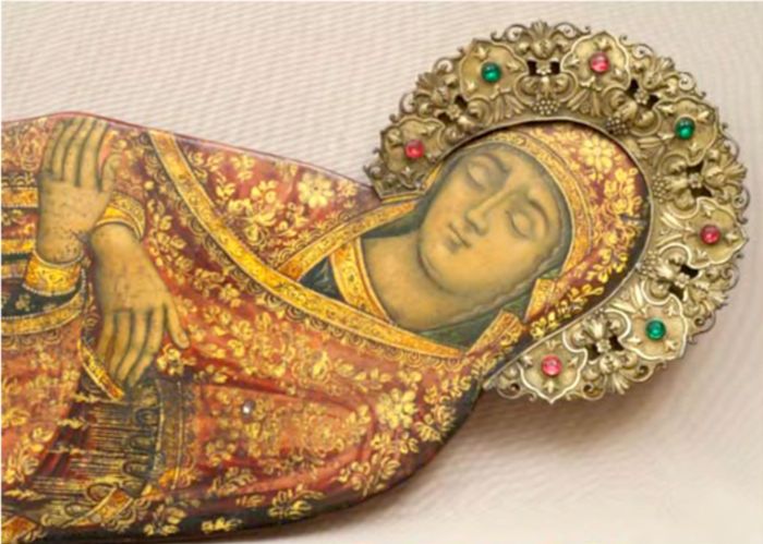 В собрании музея имеется еще одно аналогичное изображение Богоматери, вложенное в деревянный реликварий с пятигранной стеклянной крышкой и использовавшееся в качестве плащаницы[9]. (Илл. 3).