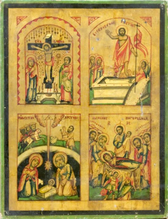 Стилистическим аналогом описанных выше произведений является четырехчастная икона[19], все сюжеты которой связаны с евангельскими событиями и могли напоминать паломнику сразу о нескольких местах, в которых он побывал на Святой Земле (Илл. 7). Распятие, Воскресение, Рождество Христово и Успение Богоматери выполнены с применением аналогичных художественных приемов и материалов, что и рассматриваемые выше иконы, имеющие надписи о месте их приобретения.