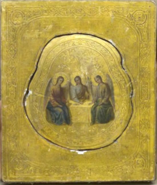 [23]. Икона «Троица Ветхозаветная». Конец ХIХ - начало ХХ в. Инв. № НВ 11378. Вкладная икона: 17,2х16х2 см. Дерево лиственной породы (дуб), паволока, левкас, масло, золото сусальное, золото твореное, тиснение по левкасу. Доска-ковчег: 26,7х22,7х3,5 см. Дерево лиственной породы (липа), паволока, левкас, золото сусальное, ткань шелковая, бархат, тиснение по левкасу. Происхождение и время поступления в музей неизвестно.