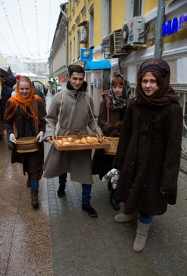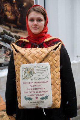 Мастерская известной московской художницы Ольги Черниковой красиво оформила саму благотворительную акцию. Благодаря ее участию наши молодые волонтеры, студенты 2 и 3 курсов Института непрерывного образования при Московском государственном юридическом университете, были одеты в настоящие костюмы конца XIX столетия, для сбора пожертвований были использованы старинные короба, рушники, лотки, с которых торговали коробейники на московских улицах более века назад. Настоящие старинные женские костюмы дополнили оригинальные шали и платки. 26 ребят приняли участие в благотворительном базаре совершенно бесплатно, разбившись на группы, они два дня трудились, предлагая открытки, календари, пирожки и кружки прохожим за пожертвования. Добрые и счастливые лица ребят просто не могли оставить прохожих равнодушными...