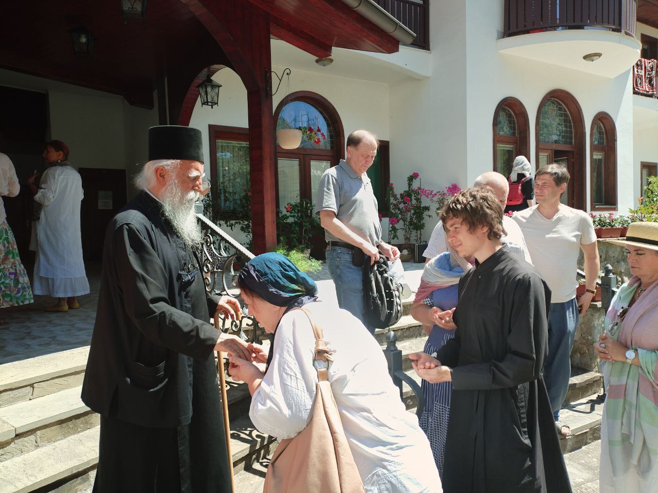 Пятница (4 июля) началась с посещения монастыря святого Стефана. Одна из 8-ми насельниц, составляющих сестричество обители, рассказала нам об истории монастыря, его святых и святынях. К сожалению, средневековый Спасо-Преображенский собор был закрыт в связи с полномасштабной реставрацией: временно богослужения совершаются в крошечной зимней церкви. Предложенное монахинями чаепитие возглавил архимандрит Авраам, которому в следующем году исполнится 80 лет. Во время братского и откровенного общения были затронуты простые и важные темы о духовной жизни, о дружбе сербов и россиян, о пастырском служении, об истории Церкви. На прощание отец Авраам благословил каждого паломника и пожелал нам доброго пути.