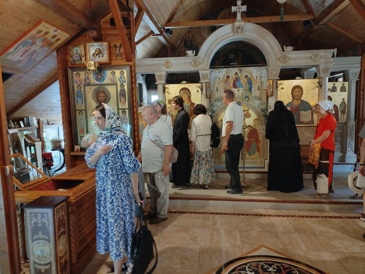 Монахиня Серафима показала нам все монастырские храмы - Покровский, Иоанна Богослова и Всех святых бессребреников. Каждая из этих церквей уникальна по внешнему виду и внутреннему убранству. В обители почивают мощи святых мучеников Емилиана, Саввы Готского, Елены Римской, Фелициана, Флавиана Кортагинского, а также множество икон с частицами мощей. После краткой молитвы, совершенной в храме, сестры угостили нас свежевыпеченными пончиками, традиционным для Сербии пирогом с капустой и персиками из монастырского сада.