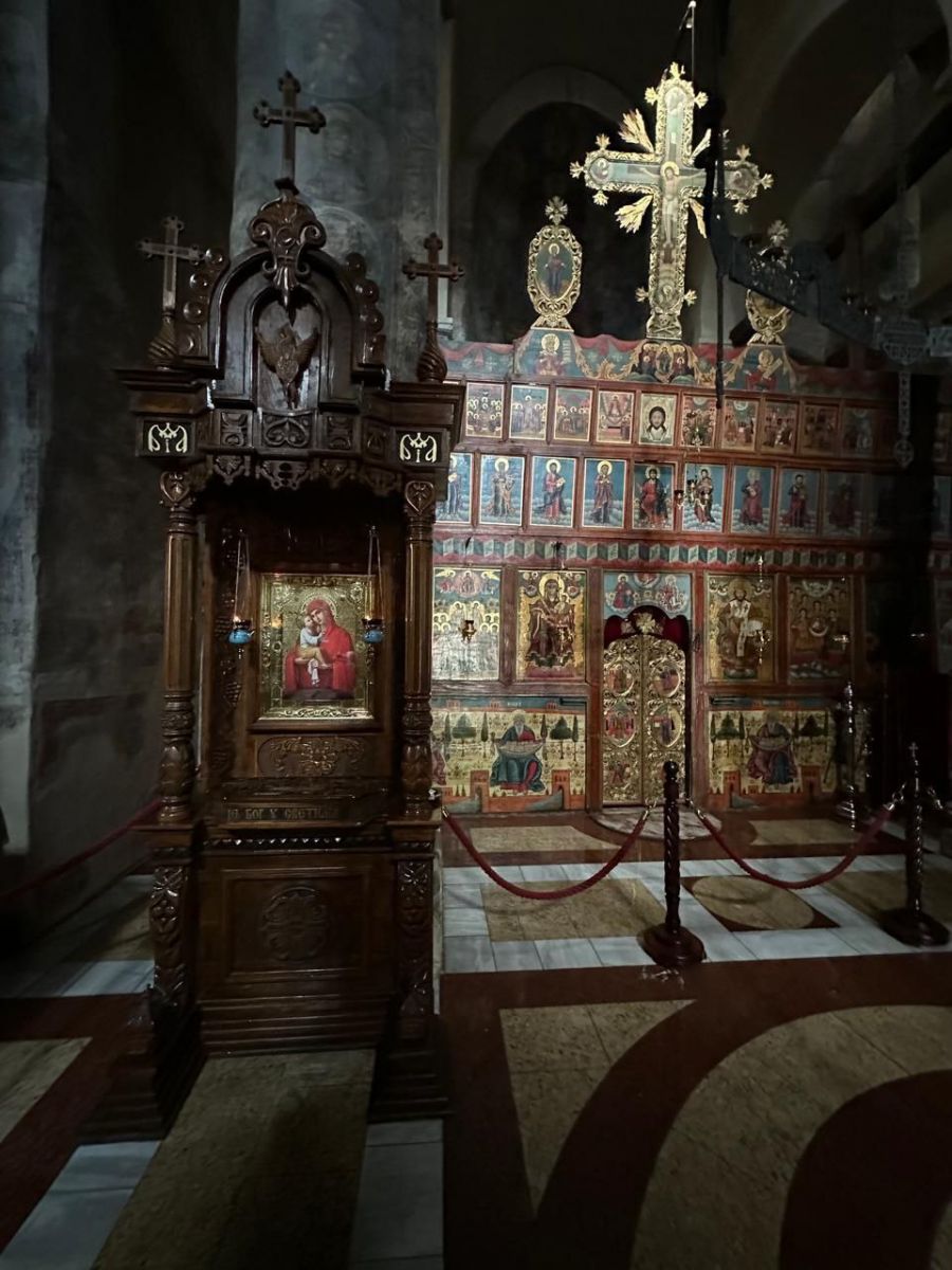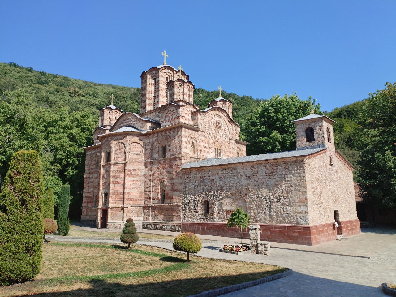 Древняя обитель, основанная в XIV веке, окружена частично разрушенными крепостными стенами и величественными башнями. В еле-еле освещённом лучами закатного солнца храме были пропето величание святому князю Лазарю Сербскому, после чего все смогли приложиться к его нетленным мощам.