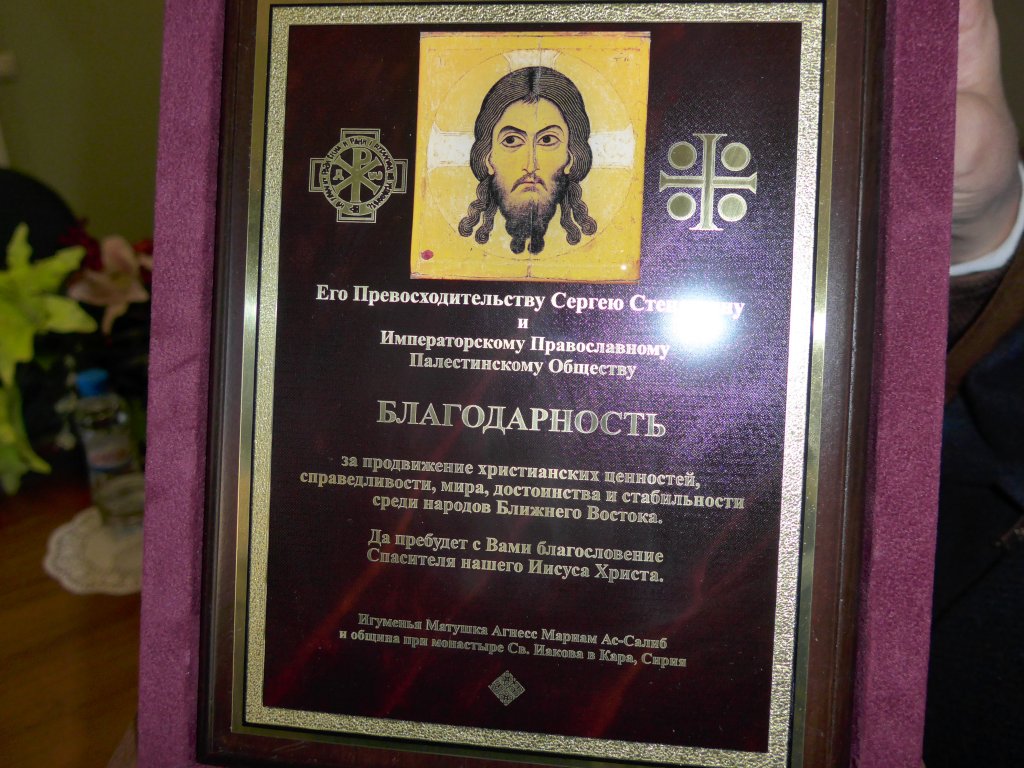 Сирийская правозащитница вручила Сергею Степашину памятный знак - Благодарность с надписью на русском языке:"за продвижение христианских ценностей, справедливости, мира, достоинства и стабильности среди народов Ближнего Востока".