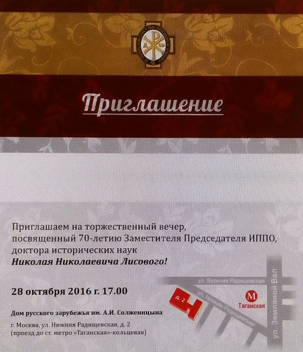 28 октября с.г. в 17.00 ИППО проводит торжественный вечер, посвящённый 70-летию со дня рождения Николая Николаевича Лисового, заместителя Председателя ИППО, известного учёного, историка, писателя, поэта и общественного деятеля.