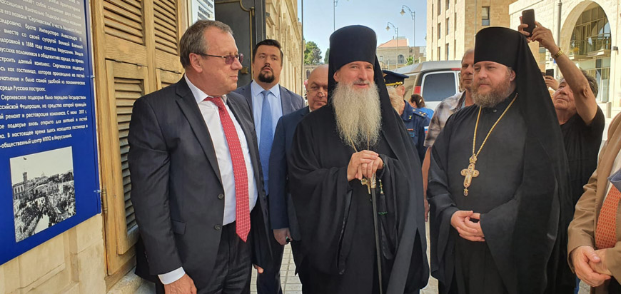 Чрезвычайный и Полномочный посол Российской Федерации в Государстве Израиль Анатолий Викторов, начальник Русской духовной миссии в Иерусалиме архимандрит Александр (Елисов) и игумен Никон у памятной таблички на стене Сергиевского подворья. 12 июня 2022 года