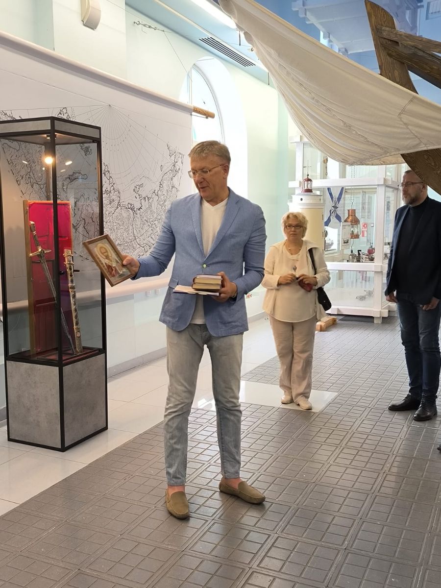 Руководитель Архангельского отделения ИППО В.И.Станулевич передает иконы святителя Николая, молитвословы и книги о Гражданской войне на Севере 1918-1920 гг с предисловием С.В.Степашина на арктические метеостанции.