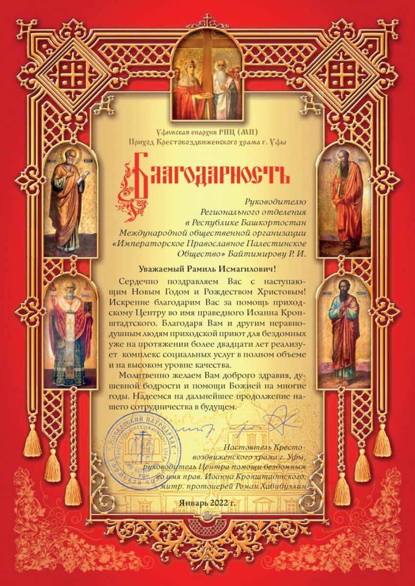 За помощь приходскому Центру отделение Императорского Православного Палестинского Общества в Республике Башкортостан получило благодарственное письмо от руководителя Центра протоиерея Романа Хабибуллина.