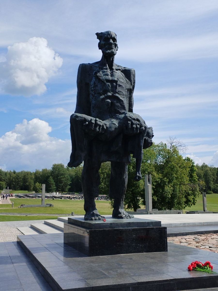 Следующая остановка была сделана в Мемориальном комплексе «Хатынь», возведённом на месте сожжённой фашистами белорусской одноименной деревни. В память о 433-х уничтоженных оккупантами населенных пунктах и погибших в годы войны более 2,4 миллионов жителей Беларуси игумен Серафим совершил заупокойную литию в находящемся на территории комплекса храме Рождества Пресвятой Богородицы. Под звуки постоянно звучащего хатынского набата мы прошли по стертым с лица земли улицам Хатыни, отдавая дань памяти павшим в годы Великой Отечественной войны.