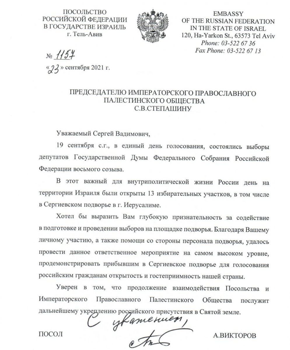 Благодарственное письмо в адрес Председателя ИППО Сергея Степашина от посла России в Израиле Анатолия Викторова