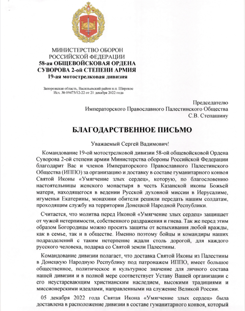 Суворова 2-ой степени армии Министерства обороны Российской Федерации выражает благодарность лично Председателю ИППО и членам Императорского Православного Палестинского Общества за организацию и доставку в составе гуманитарного конвоя