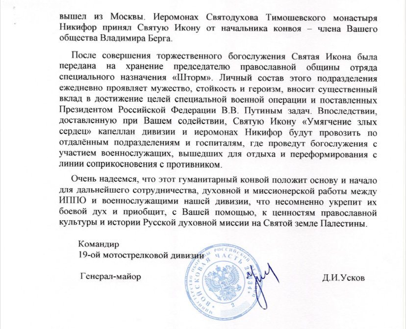 Благодарственное письмо в адрес Председателя ИППО Сергея Степашина от командира 19-ой мотострелковой дивизии генерал-майора Д.И.Ускова