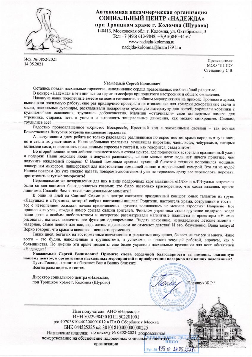 В адрес Председателя Императорского Православного Палестинского Общества Сергея Степашина поступило благодарственное письмо от директора социального центра «Надежда» при Троицком храме г.Коломна (Щурово) Жанетты Полищук.