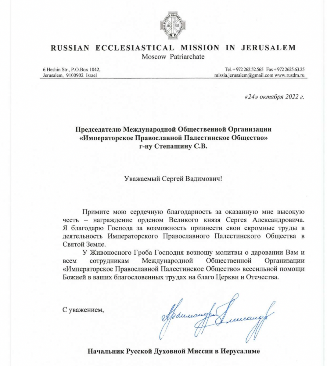 В адрес Председателя ИППО Сергея Степашина поступило благодарственное письмо от Начальника Русской Духовной Миссии (РДМ) в Иерусалиме, члена Совета ИППО Архимандрита Александра (Елисова).