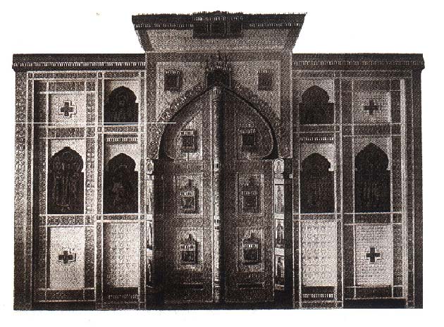 На них, в металлических киотцах, помещались Благовещение и четыре евангелиста. Мастера-реставраторы покрыли «тело» нового иконостаса цинковыми пластинами, на которых воспроизвели все украшения царских врат «частию позлащением и частию посеребрением». Двери главного входа в алтарь висели на колонках, на которых были изображены лики Спасителя, Богоматери, херувимов, святителей и архидиаконов, помещённые в киотцы. Образа для иконостаса писали лучшие живописцы. Это были копии с сохранившихся древнерусских икон.
