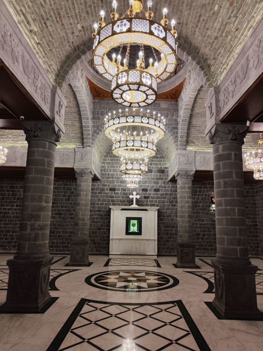 Ещё одна реликвия вселенского масштаба ждала нас в Хомсе – это Пояс Богородицы. Части его рассеяны по миру: частицы есть и в Москве в храме Ильи Обыденного, довольно крупная часть есть на Афоне в монастыре святого Павла. Но в Хомсе хранится самая большая его часть. Храм этот находится в юрисдикции Сиро-Яковитской Церкви, но надо отдать должное, местные священники очень тепло встречают православных. Отец Серафим совершил молебен перед реликварием с Поясом Божией Матери. Теперь эта святыня хранится в специальном мраморном киоте в отдельно построенном зале-часовне. Пояс находится в ковчеге в виде серебряной звезды и свёрнут в рулончик в её центре. Дар Богородицы, преподнесенный в утешение апостолу Фоме, греет и утешает и сегодня паломников-христиан. И здесь мы снова не остались без подарков: вода из бьющего под храмом источника, ладан, масло. Но и это еще не всё: нам открыли подземную крипту – и мы оказались в храме, который был обустроен на этом самом месте аж в 59 году!