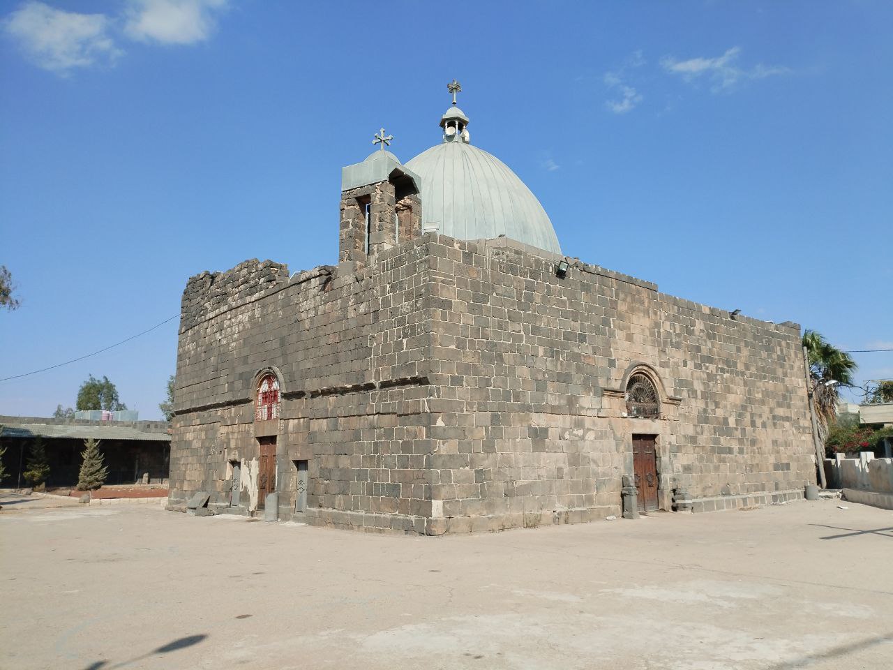 В последний день нашего пребывания в Сирии мы посетили древний храм в городе Изра – храм Георгия Победоносца 515 года. Здесь находится могила, в которой был похоронен великий святой, но мощи его были вывезены крестоносцами ещё в средние века. В алтаре (под мраморным саркофагом), по преданию, остался палец святого и его щит. Раскопок не проводилось. Но место безусловно очень древнее. Это видно по кладке без раствора с идеально подогнанными друг к другу камнями. Настоятель храма знает о том, что Георгий Победоносец изображён на гербе Москвы, и было видно, что наше появление не просто приятно, а своего рода надежда на то, что жизнь наладится даже в таком непростом месте. Из разговора с ним мы узнали, что за время ведения боевых действий в городе от бомбардировок и обстрелов не погиб ни один человек. Все жители – и мусульмане, и православные – твердо уверены в том, что это чудо не могло произойти без участия Георгия Победоносца.