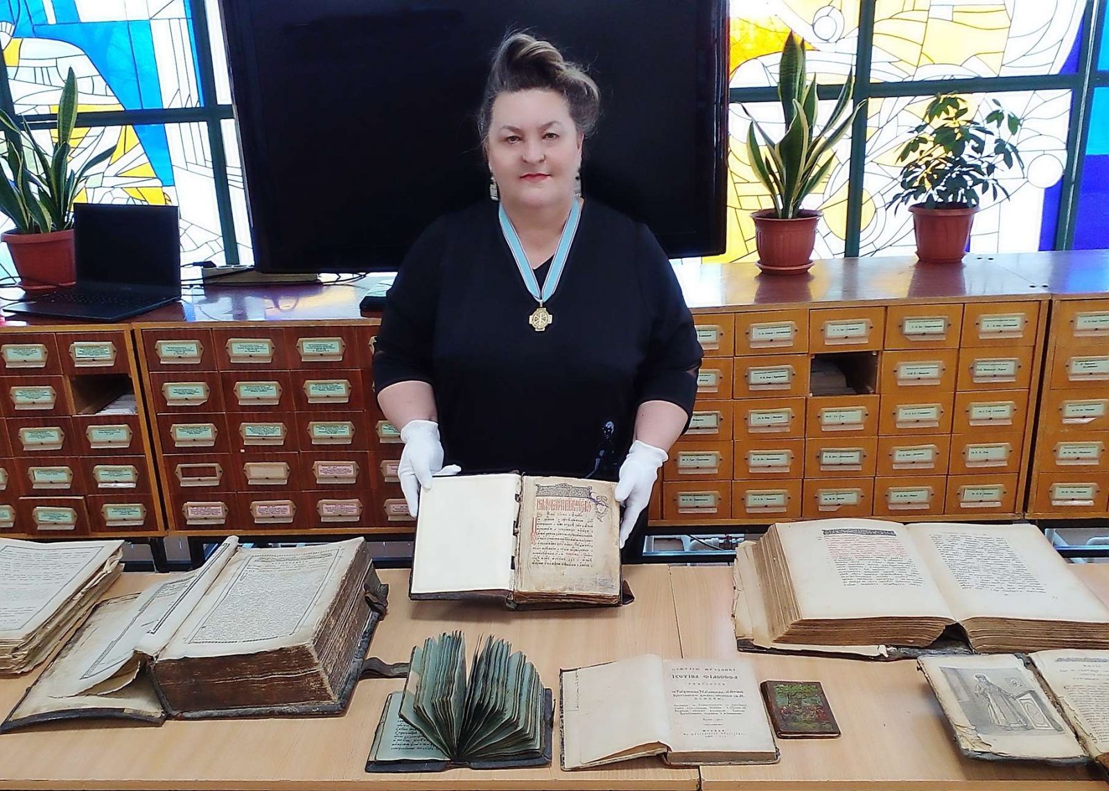 Ирина Талдыкина представила выставку старопечатных книг из фондовой коллекции Волгоградского областного краеведческого музея, подчеркнув, что такие экспонаты первый раз за всю историю музея покинули его стены, некоторым изданиям более 250 лет. Какие книги увидели присутствующие? Это Елизаветинская Библия, 1751 года издания; книги, напечатанные в XIX - нач. XX вв. - Следованная Псалтирь, «Часовник», «Сочинения святого Дмитрия, митрополита Ростовского» (с надписью на колофоне «Сия книга принадлежит Михайловской станицы уряднику Михаилу Александровичу Миронову»), «Кормчая» (сборник церковных и светских законов, являющихся руководством при управлении Церковью и в церковном суде православных славянских стран), «Октоих» (старообрядческая певческая рукопись), книга-миниатюра рукописная для записи священных текстов и молитв, старообрядческий молитвенник, «Святого мученика Устина Философа. Разговор с Трифоном Иудеанином о истине Христианского закона, писанный к М.Помпею (переложен с эллиногреческого на российский язык Синодальным членом и ордена св.Александра Невского Кавалером, Иринеем, архиепископом Тверским и Кашинским).