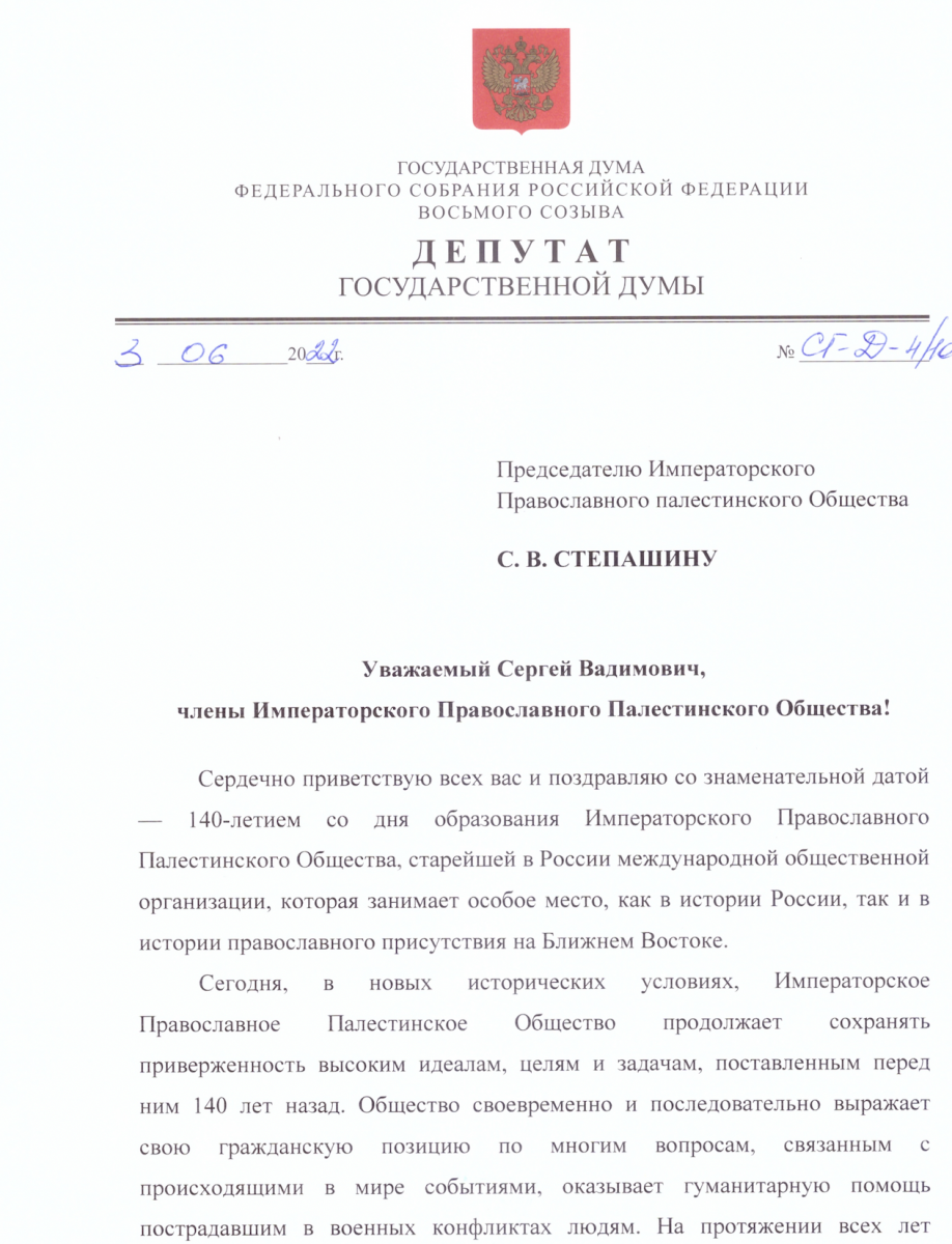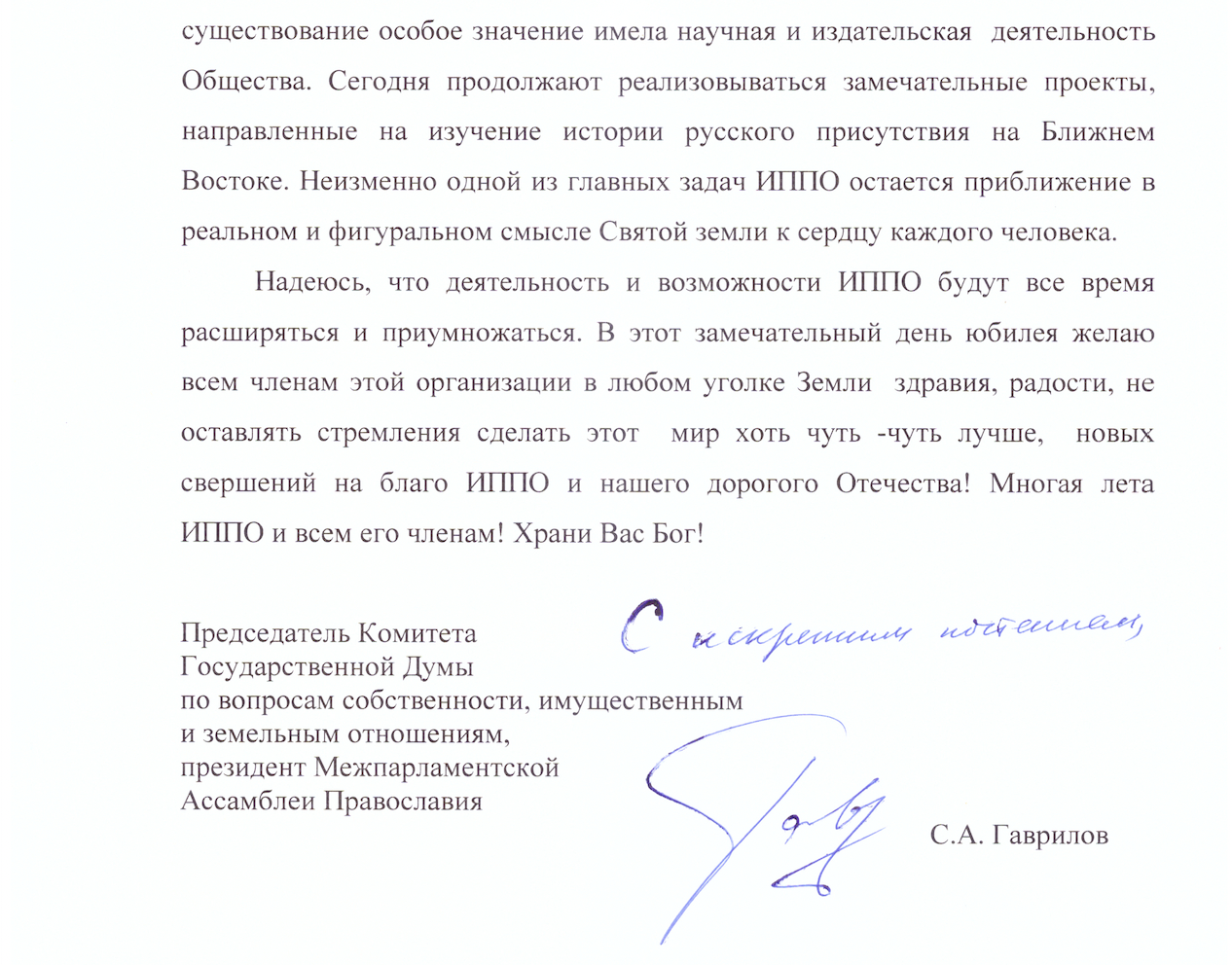 Член Совета ИППО, председатель Комитета Госдумы по вопросам собственности, имущественным и земельным отношениям, президент Межпарламентской Ассамблеи Православия (МАП) Сергей Гаврилов направил поздравление в адрес Председателя ИППО Сергея Степашина в связи со 140-летием со дня основания Императорского Православного Палестинского Общества.