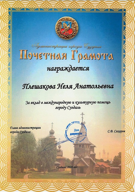 27 сентября Глава администрации города Суздаль Сергей Сахаров вручил руководителю Кипрского отделения ИППО Леониду Буланову Почетную грамоту города Суздаль за вклад в международную и культурную помощь.