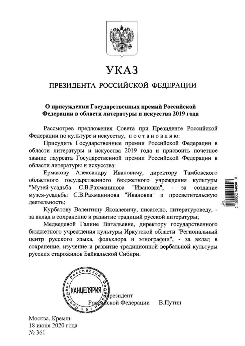 Члену Псковского отделения ИППО Валентину Курбатову присуждена Государственная премия Российской Федерации
