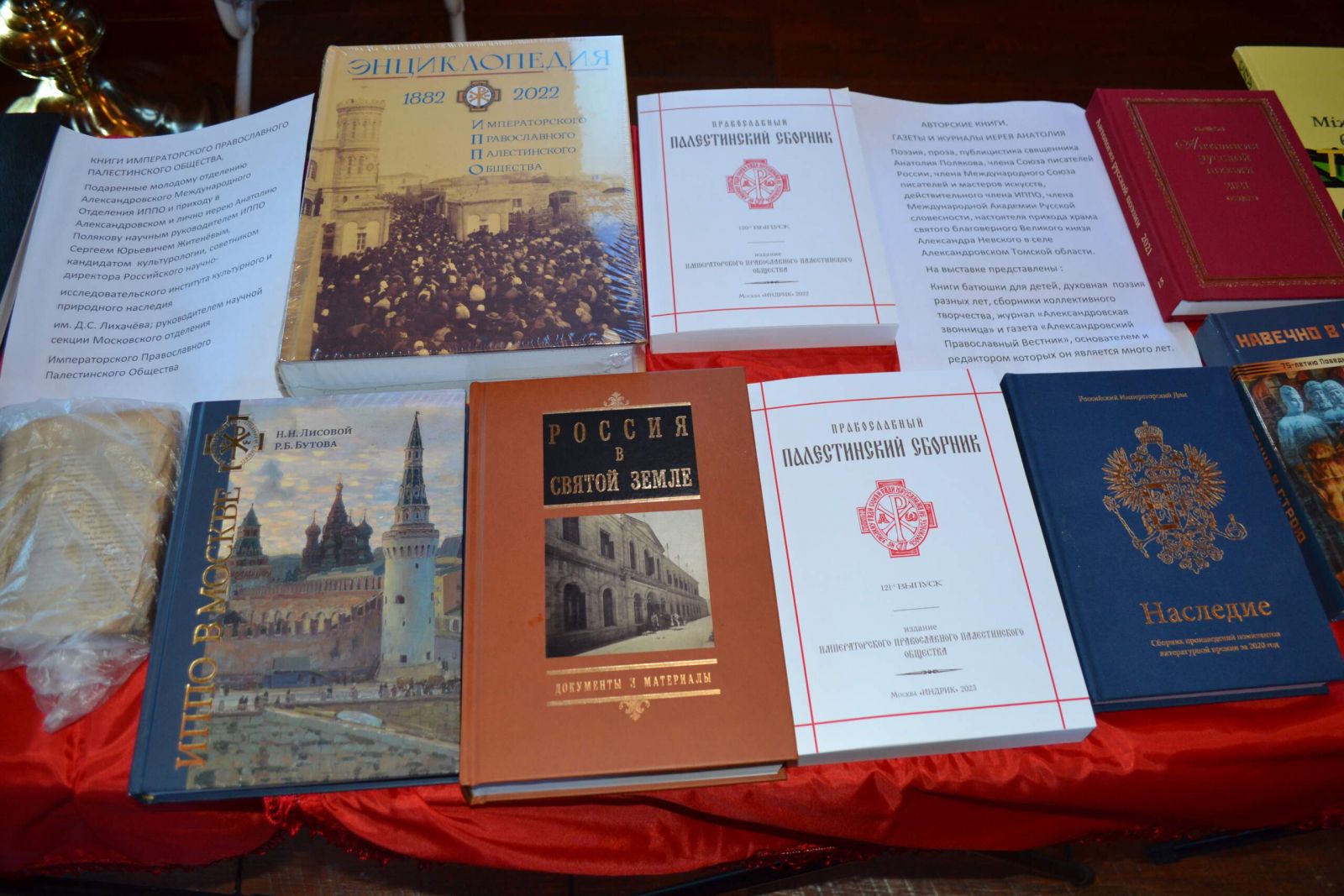 Гордость выставки - книги, подаренные руководителем Научной секции Императорского Православного Палестинского Общества Сергеем Житенёвым приходу храма Cвятого Благоверного Князя Александра Невского и лично отцу Анатолию.