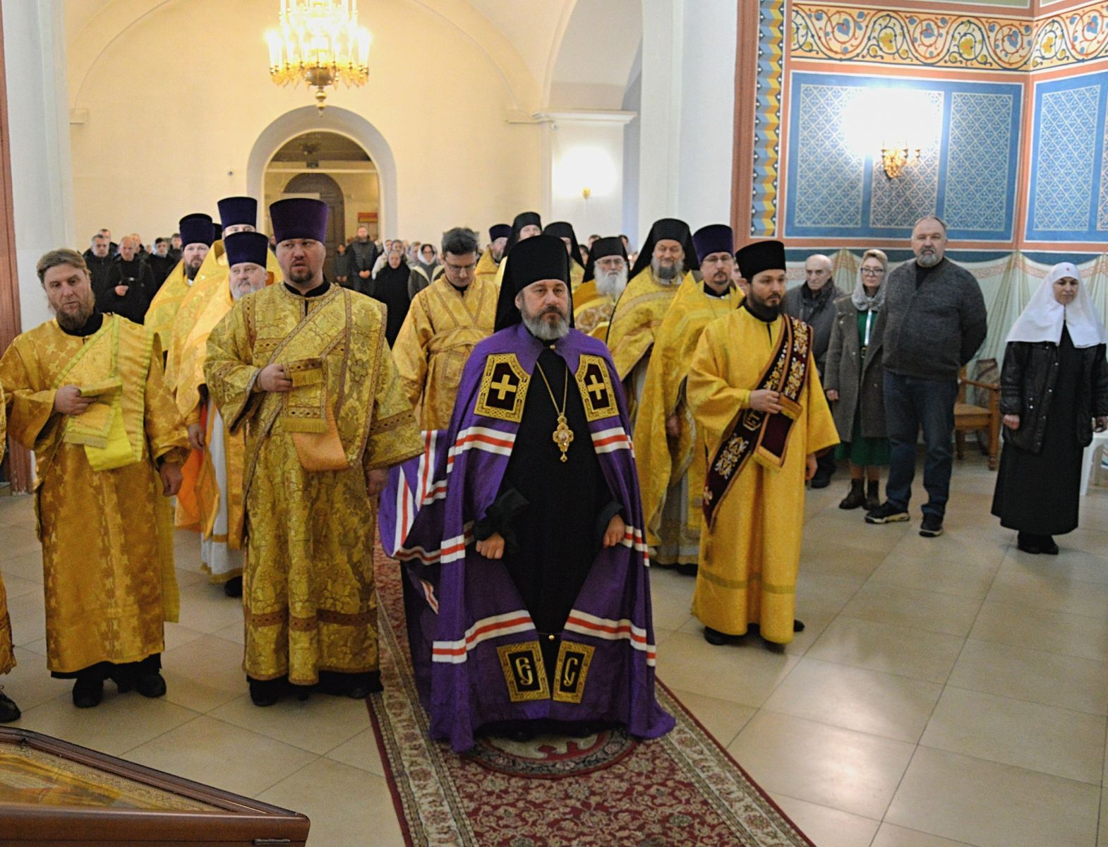 Его Преосвященству сослужили секретарь епархиального управления иерей Антоний Чуть, благочинные церковных округов, игумены монастырей, клирики собора и духовенство епархии. Среди сослужащего духовенства были члены совета Александровского местного отделения ИППО настоятель Михаило-Архангельского монастыря г. Юрьев-Польского игумен Афанасий (Селичев), настоятель Богородице-Смоленской Зосимовой пустыни игумен Серафим (Семилетов) и благочинный Петушинского округа протоиерей Сергий Березкин.